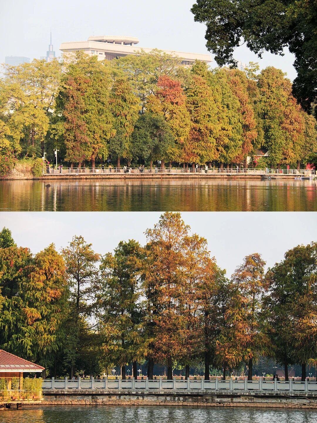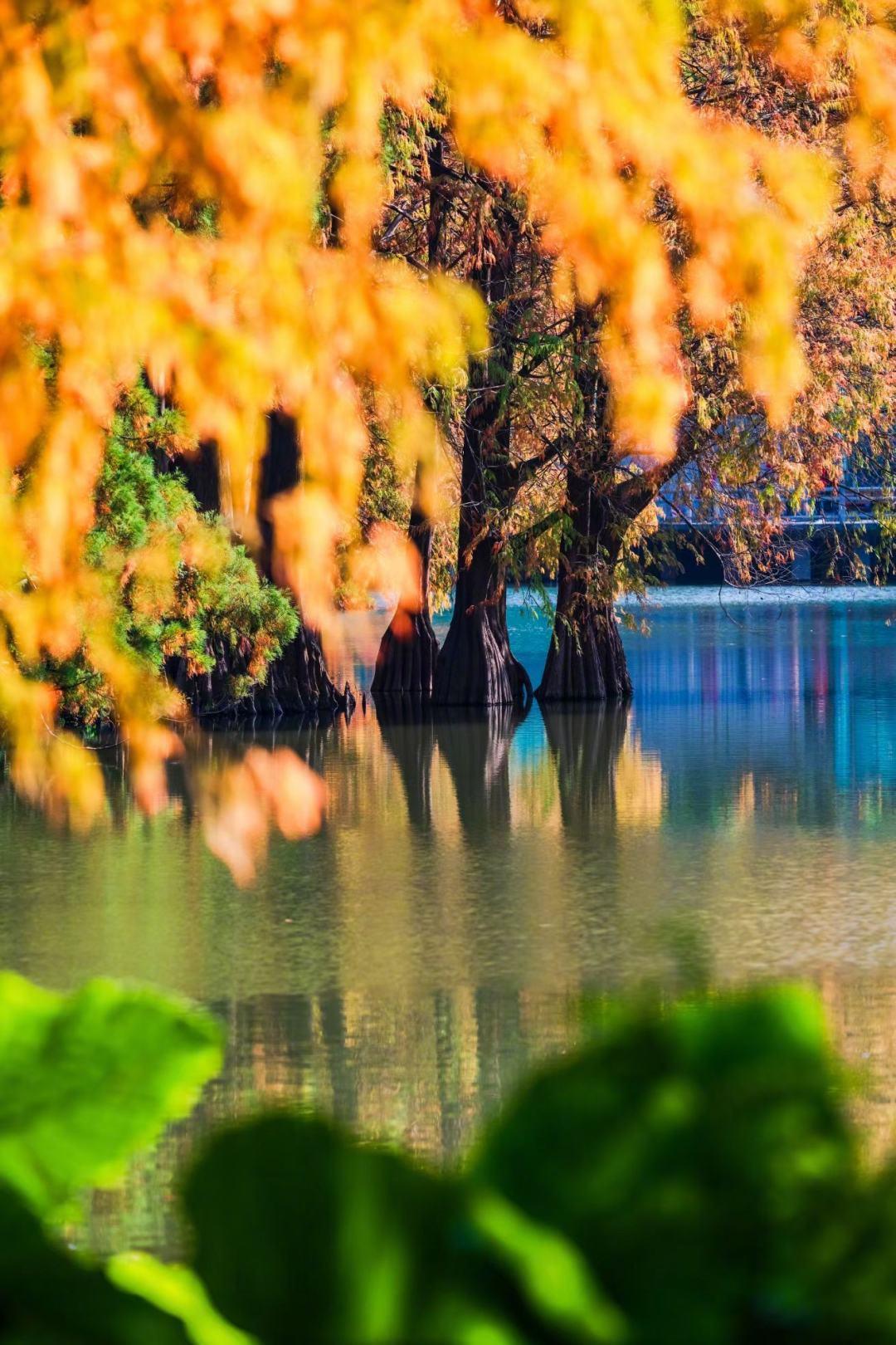 四大免费公园,落羽杉呈现焦糖色、枫叶橘、落日金等丰富色调,湖光树影相映成趣。
