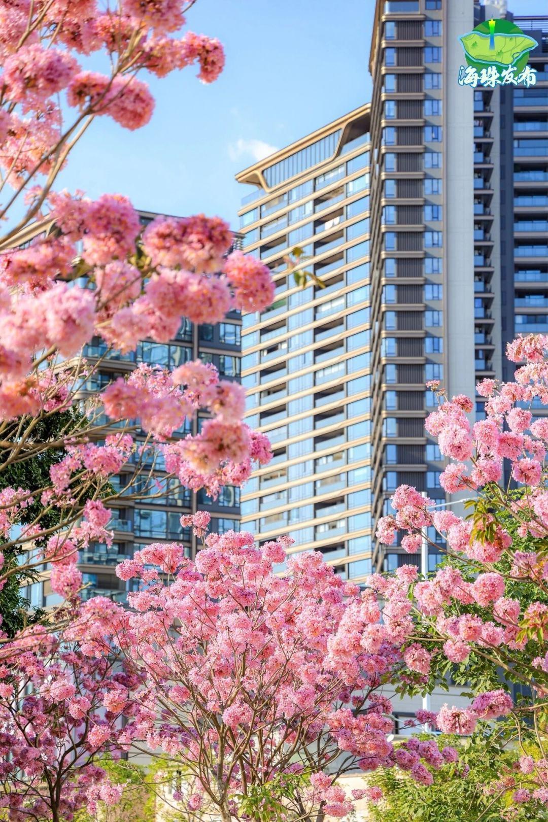 沿江绿道边紫花风铃木进入全盛期,粉紫色花球饱满轻盈,宛如一串串精致风铃,搭配珠江江面与船只,浪漫氛围感拉满。