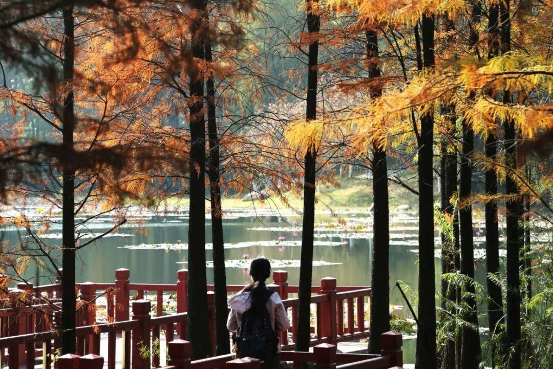 华南国家植物园的“网红”落羽杉进入最佳观赏期,红橙相间的枝叶倒映湖面,宛如冬日限定油画,吸引众多游客驻足打卡。