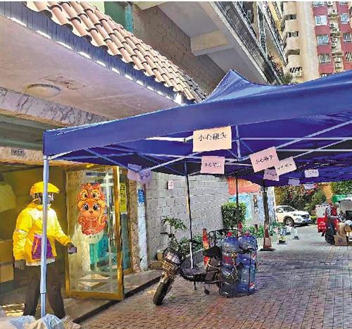 发生外墙脱落的楼栋门前已经安装起了几顶帐篷作为保护措施。