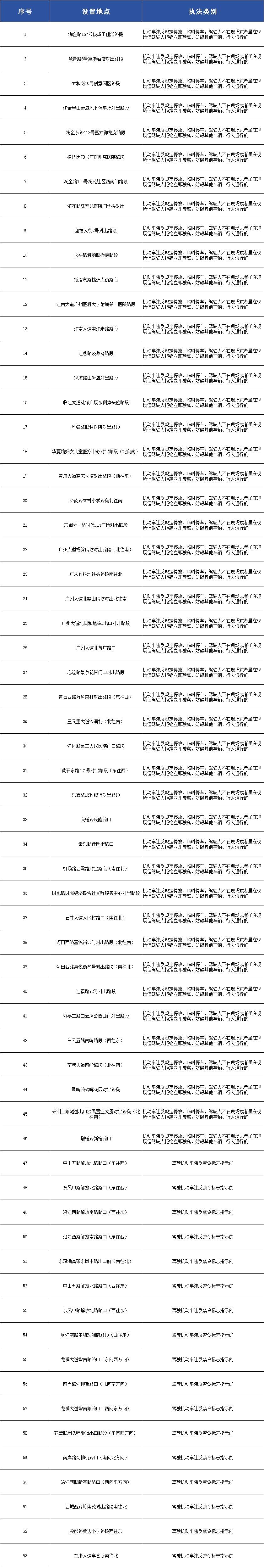 记者1月12日从公安机关交通管理部门获悉,广州市公安局交通管理支队新增63套交通技术监控设备。该批执法类别涉及“机动车违反规定停放、临时停车,驾驶人不在现场或者虽在现场但驾驶人拒绝立即驶离,妨碍其他车辆、行人通行的”“驾驶机动车违反禁令标志指示的”等。
