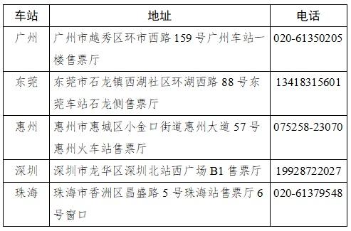 1月18日至1月30日,每日8:00—12:00、14:00—17:30期间,珠三角地区用工规模不少于300人的务工企业可于开车前20天到广州、深圳、东莞、惠州、珠海5个车站的专项办理窗口,现场办理同一日期、车次、方向、席别(硬座、软座、硬卧、二等座、二等卧)300人及以上的包车厢、包列团体订票业务。订票时,具体可办理2月6日至2月14日广东地区始发、2月21日至2月28日湖南地区始发的部分列车(以各办理点公布为准)。