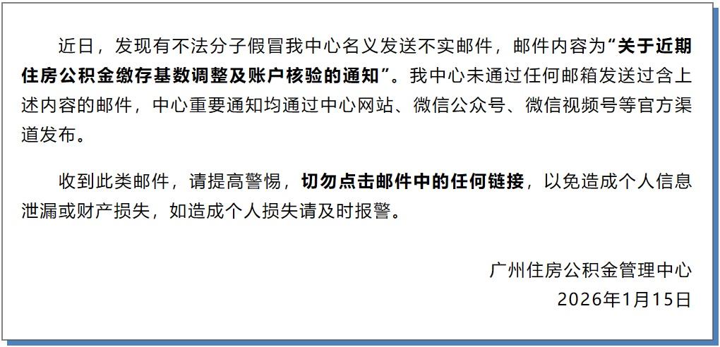 1月15日晚,广州住房公积金管理中心发布关于假冒中心名义发送不实邮件的严正声明。