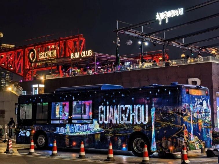 记者了解到,这是广州巴士集团打造的“移动音乐派对巴士”——珠江霓虹铛铛巴士。车身以深邃宝蓝为底色,绘有艺术化的城市天际线,繁星点点与霓虹灯牌交相辉映,成为珠江畔亮眼风景线。