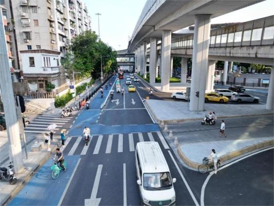对宽度大于2.5米的非机动车道,此次改造采用淡蓝色彩色铺装,通过在沥青路面上加铺薄层彩色材料,实现交通引导、安全提升与环境美化等多重功能。