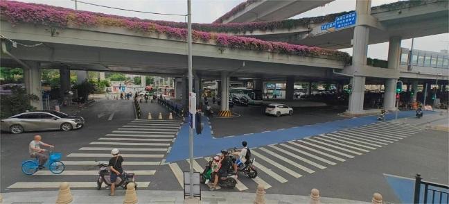 针对工业大道部分路段非机动车道宽度不足的问题,本次改造创新设置“共享车道”,将最右侧机动车道与既有非机动车道合并,利用1.1米高隔离护栏与左侧车道分隔,形成宽度不低于3.25米、限速40km/h以下的连续通行空间。改造后,非机动车通行量提升50%以上,机动车通行未受明显影响,较好地平衡了两类车辆的通行需求。