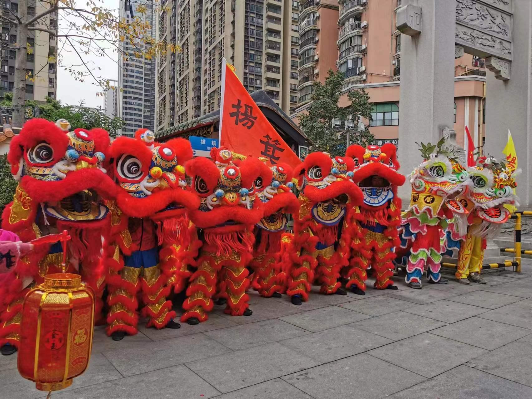 醒狮一字排开等候活动开始。信息时报记者 张玉琴 摄