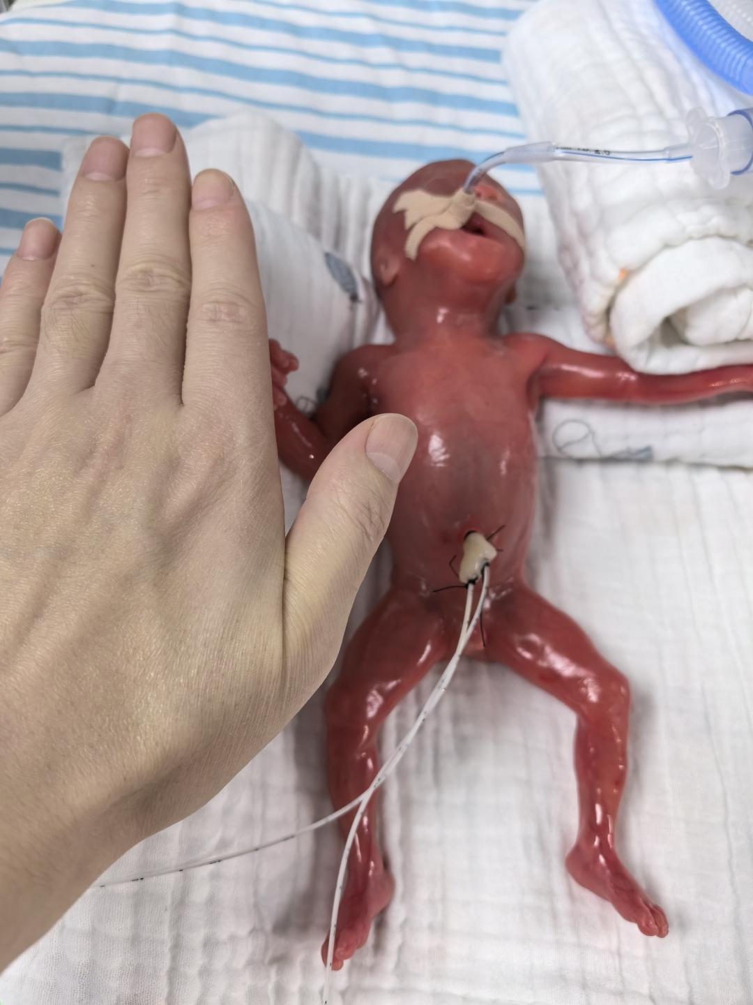 经过产科医生紧张忙碌的操作后,小“肉肉”顺利出生,全身皮肤青紫呈胶冻状,眼裂都没有长开,大腿只有成人手指那么粗,整个人看上去仅仅比注射器长一点点,没有自主呼吸,没有活力。