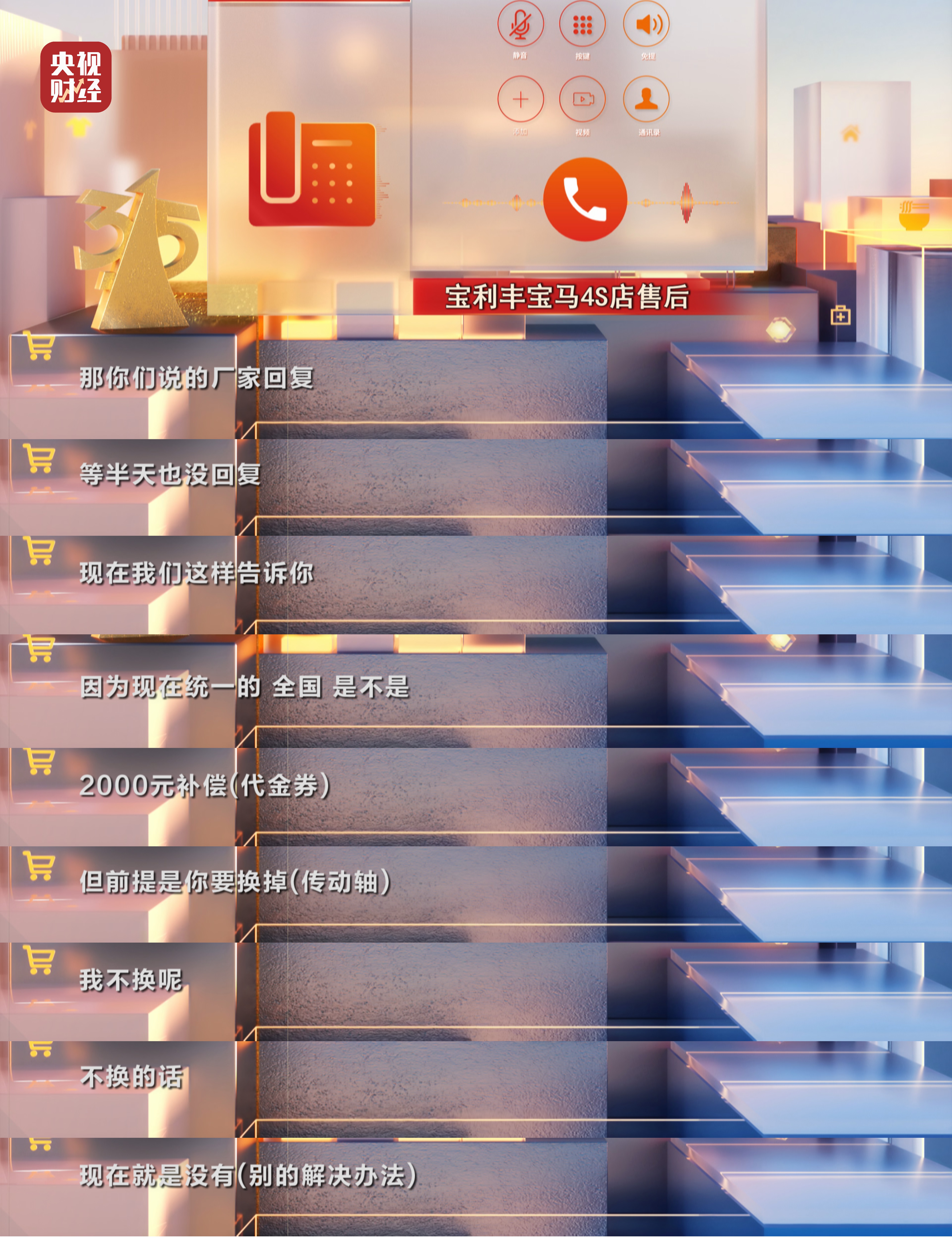 传动轴,是汽车动力总成中重要部件,刚买的新车就要更换传动轴,等同于新车要动个“特大手术”,李先生坚决不同意。在与4S店多次交涉无果后,无奈之下,李先生拨通了宝马厂家的客服电话。客服人员的回答让李先生的心凉了半截。