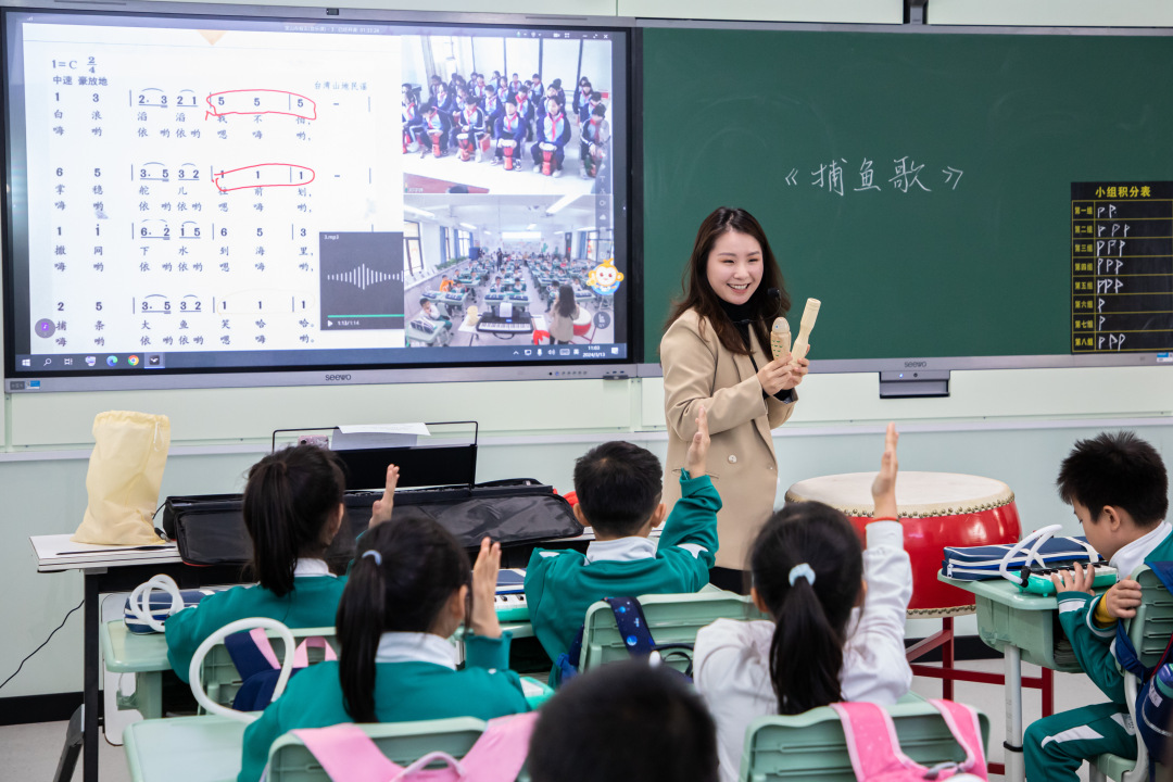 “白浪滔滔我不怕,掌稳舵儿往前划……”早上10点30分,学生们正上着一堂别开生面的音乐综合课,一名来自兴宁市宝山小学的“线上”音乐老师与一名本校“线下”音乐老师同时教学,通过一首豪放、动听的《捕鱼歌》,运用律动、演唱、演奏、情景剧等方式,引领学生置身于海边捕鱼场景中。