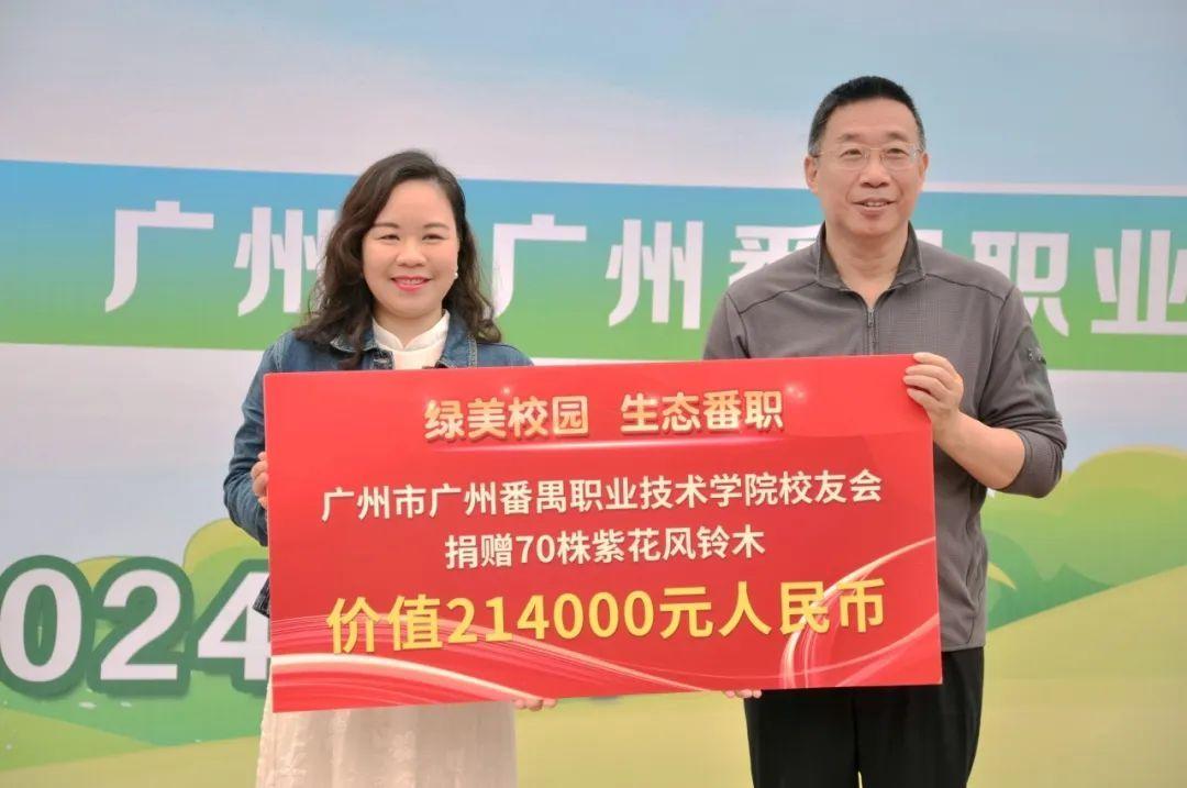 为响应绿美广东生态建设,近日,“绿美番职计划”暨校友林种植活动在广州番禺职业技术学院(简称番职院)举行。200余名校友认捐了价值21.4万元的70株一级紫花风铃木,与学校师生一起打造有显示度的校园绿化景观,共建美丽幸福校园。
