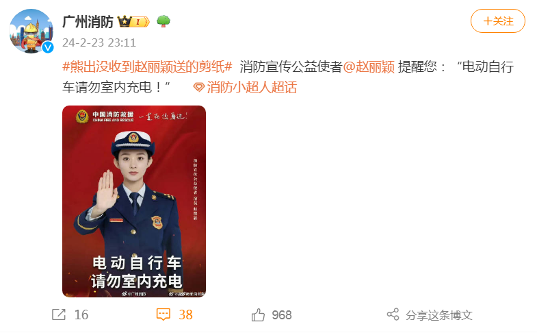 2月,广州市迎来多轮寒潮,居民用电用火用气量增多,加之冬季寒冷干燥,火灾风险走高。2024年春节档,消防宣传公益使者@杨紫、@赵丽颖 参演的影片热度较高。“广州消防”微博号借助明星效应、春节档影片热度,积极设置议程,发布微博提示公众关注冬季消防安全。如2月23日,@广州消防 加挂话题#熊出没收到赵丽颖送的剪纸#,发布微博称,消防宣传公益使者@赵丽颖 提醒您:“电动自行车请勿室内充电!”再如,2月29日,@广州消防 发布“杨紫提醒大家注意冬季消防安全”,并附上微博话题#杨紫票房总成绩破80亿#,一定程度上通过“搭车效应”起到同步宣传消防安全的效果。前述微博评论区,网民纷纷表示,“和中国消防宣传公益使者@赵丽颖 一起关注消防,生命至上,共筑消防安全屏障”“和杨紫一起关注消防安全”“消防安全,人人有责!”