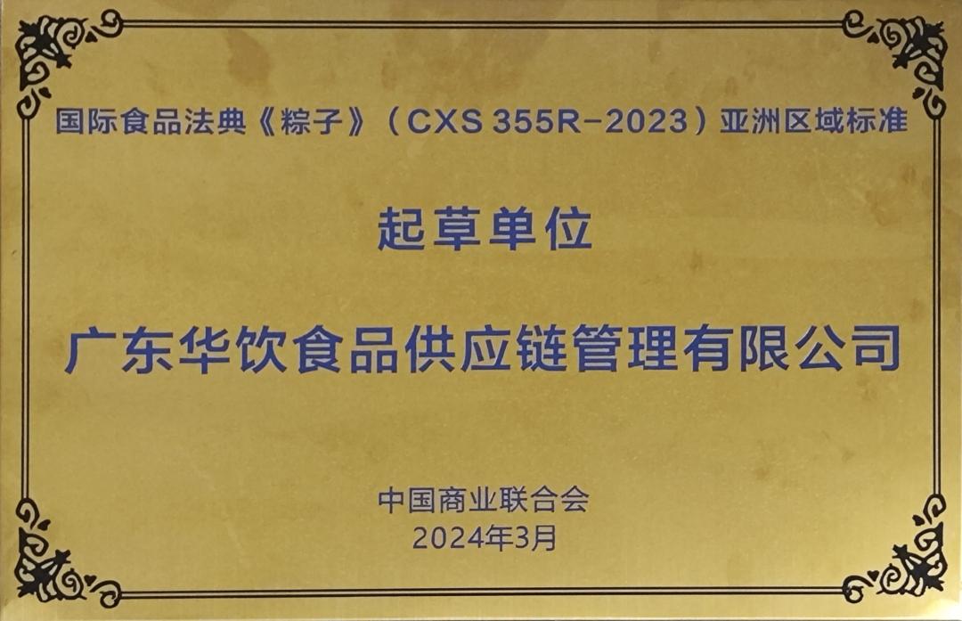 华饮公司与五芳斋、稻香村,三全食品、思念食品等老字号品牌、食品企业、科研院所,结合自身企业实际和行业资源全程参与《粽子》标准的项目提案、文本起草、征求意见、审议文本等重要程序中,共同制定该标准,前后历时7年才迎来了标准的正式发布。会上,广东华饮食品执行总裁段正辉代表公司接受标准起草单位授牌。