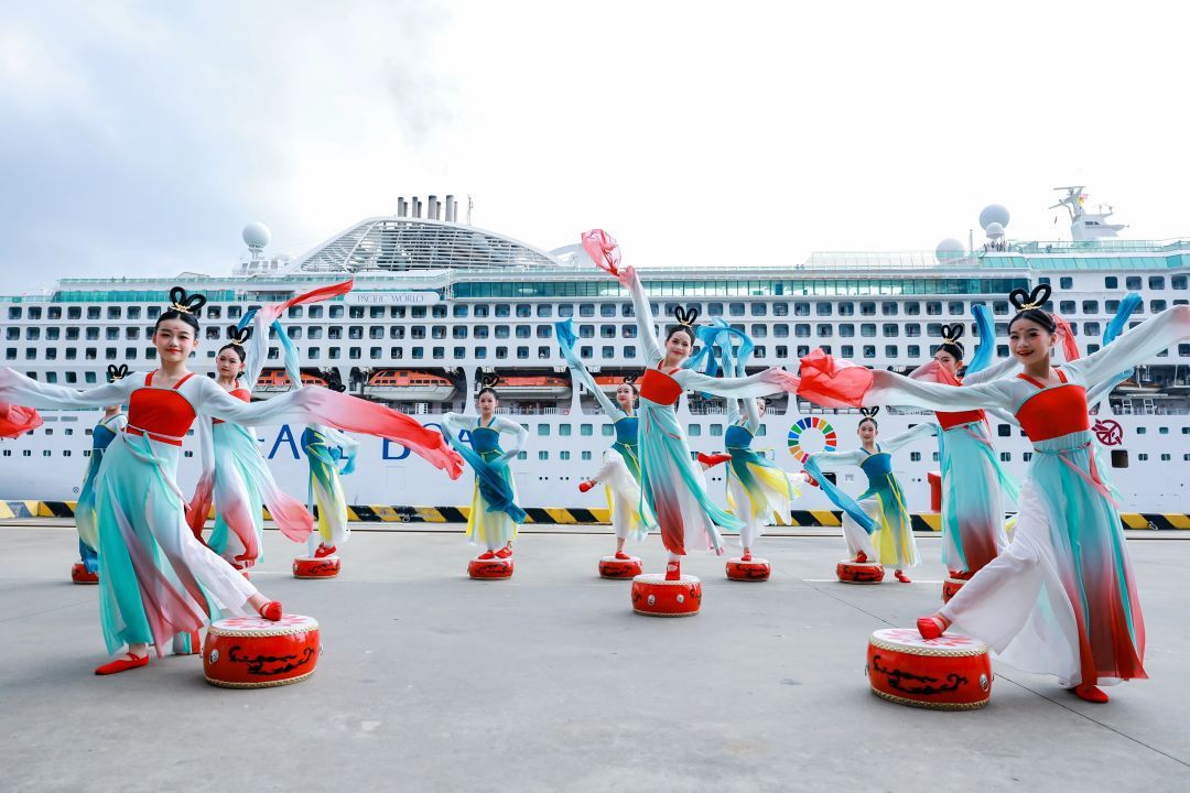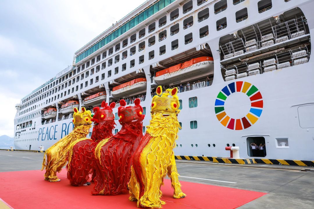 当天,在深圳市交通运输局、深圳市文化广电旅游体育局、深圳市南山区政府、招商局蛇口工业区控股股份有限公司的指导下,招商蛇口国际邮轮母港有限公司与和平之船环球邮轮共同主办了主题为“中日’邮’好,相约深圳”的欢迎仪式,蛇口邮轮母港和“和平之船”环球邮轮互相交换礼物纪念这一历史时刻。在邮轮码头、入境廊道、客运大厅和邮轮剧场,蛇口育才教育集团带来多场少儿舞狮、汉唐舞、京剧、手风琴、琵琶等欢迎节目,在客运大厅的非遗市集呈现多个非遗展览与沉浸式体验项目,向国际游客展示深圳少年的中国风采及博大精深的中华优秀传统文化。