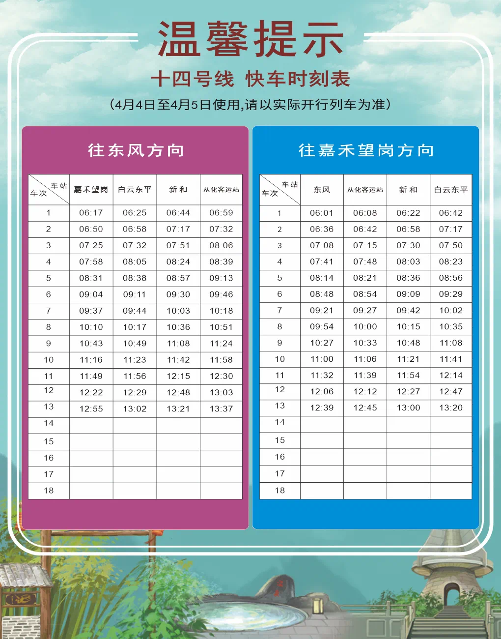 十四号线4月3日12:00至运营结束,4月4日-5日13:00至运营结束,4月6日13:30至运营结束,快车改为普通车运行。为进一步提升大客流区段的运输能力,4月6日当天,十四号线13:30-21:00期间调整为长短线运行模式,长线运行区段为嘉禾望岗站-东风站,短线运行区段为嘉禾望岗站-太平站。