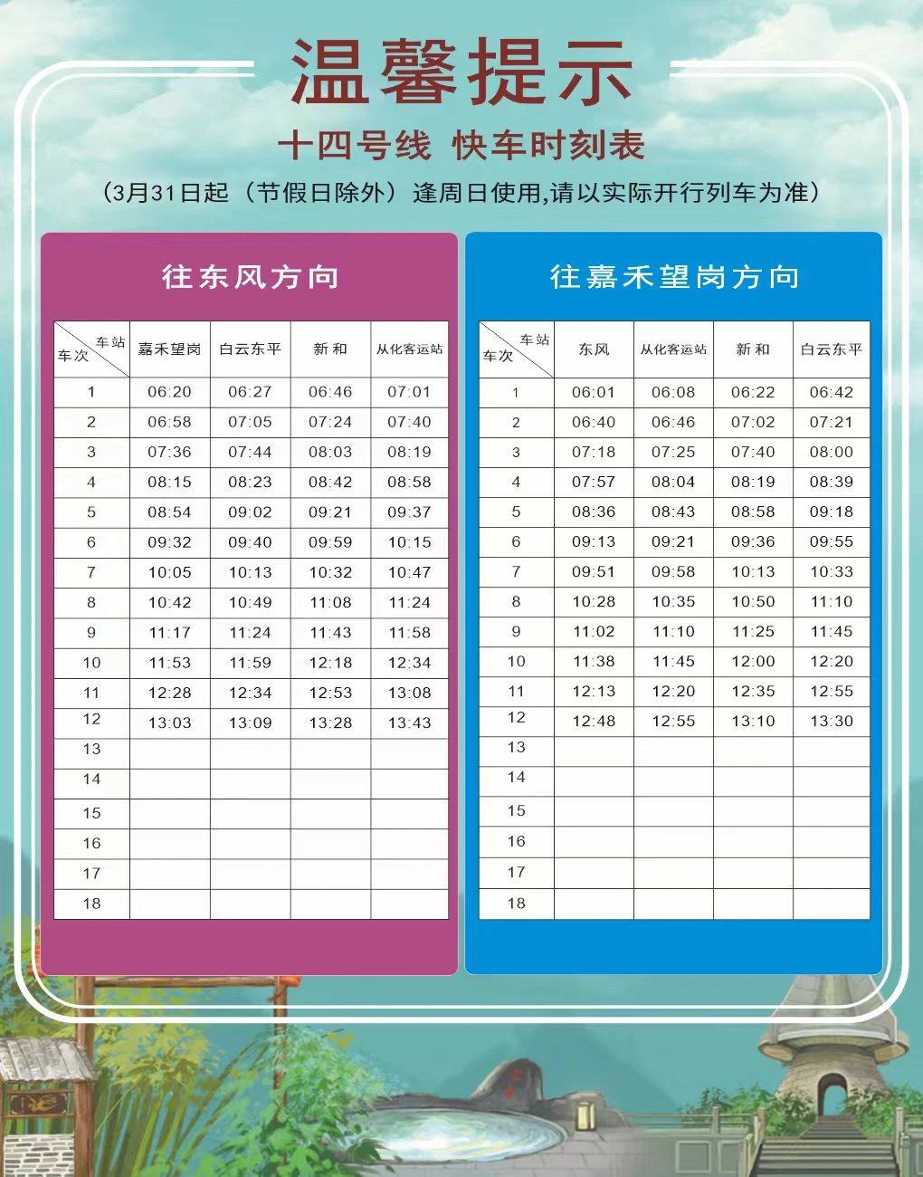 为满足周日市民出行和学生返校需要,自3月31日起,十四号线(嘉禾望岗站至东风站)将采用周日专用运行图,通过增加列车上线、压缩行车间隔等方式进一步提升运力投放,周日高峰起峰时间提前2小时,由15:00-22:00调整为13:00-22:00。