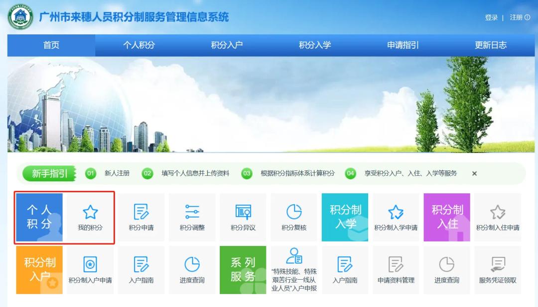申请人电脑登录“广州市来穗人员积分制服务管理信息系统”(或输入网址:https://djf.lsj.gz.gov.cn/bjfpublic/#/home),点击“个人积分”模块提出积分申请,获得核定积分(每天都可以申请,拿到受理回执后,约20个工作日出核定积分)。