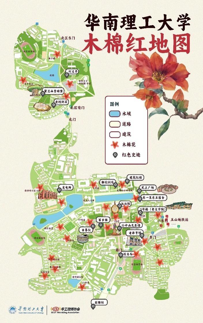 华南理工大学校内究竟有多少株木棉树?学校FRESH环保协会、微博协会的同学们跑遍学校五山校区每个角落,为木棉花树建立数据库,绘制出“华南理工大学木棉红地图”,标记出校区所有木棉花的具体位置,并结合校园内的红色史迹,设计打卡路线,方便师生游览参观。