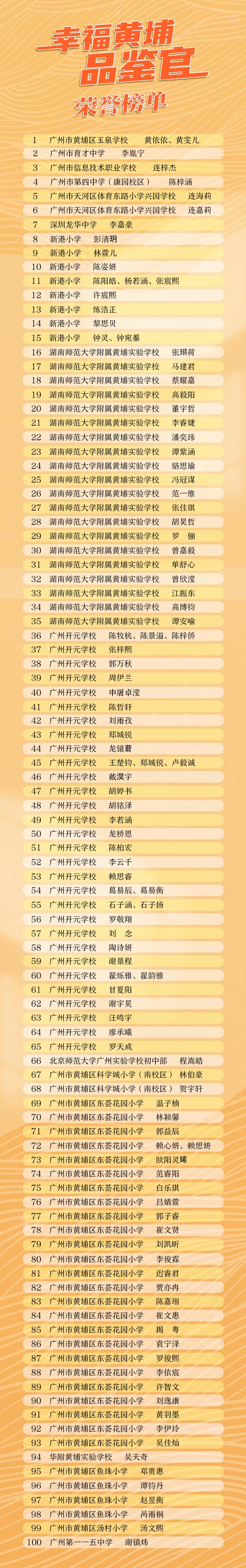 由广州日报报业集团、中共广州市黄埔区委宣传部、黄埔区融媒体中心联合主办的“大道之行 幸福黄埔”大型系列城市品牌传播活动自去年年底启动后,推出了“沿着大道citywalk,打开广州黄埔新方式”H5手绘地图,并发起“大道之行 幸福黄埔”全民有奖“打卡”、第二届“幸福黄埔体验官”暨百名“幸福黄埔品鉴官”评选等系列活动。继去年12月23日第二届“幸福黄埔体验官”集体亮相后,同样由广州市教育局指导的第二届百名“幸福黄埔品鉴官”名单今日正式出炉(名单附后)。