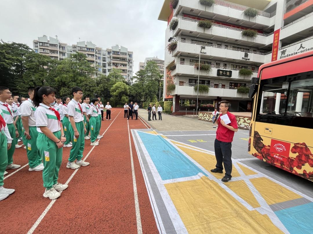 4月1日,“英雄花开英雄城 公交文化进校园”主题活动在广州市南武中学举行。本次活动属于2024年“英雄花开英雄城”系列活动之一,在广州巴士集团第一分公司与广州市南武中学的组织下,一辆“红棉公交”开进校园,现场开展实验,向学生揭示公交视野盲区的危险性。