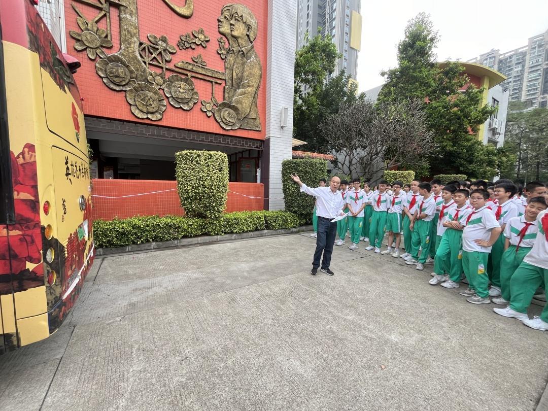 李智伟于1999年成为了一名公交车长,至今已在公交行业奋斗了25年。不少南武学子对他很熟悉,因他平时负责营运接送南武中学学生返校的如约线路,同学们都喜欢叫他“小胡子叔叔”。他介绍道,同学们眼前的这辆“红棉巴士”,车身上的图案活用了中国美协副主席、广东美协主席林蓝的国画作品《春天》,以金色为浓墨重彩的底色、通过红色颜料层层叠加铺陈出鲜艳蓬勃的木棉花形象。这辆“红棉巴士”巡游在广州新老城区之间,将“红棉文化”的独特魅力带到了城市的各个角落,同时也把英雄文化传播到市民乘客的心中。
