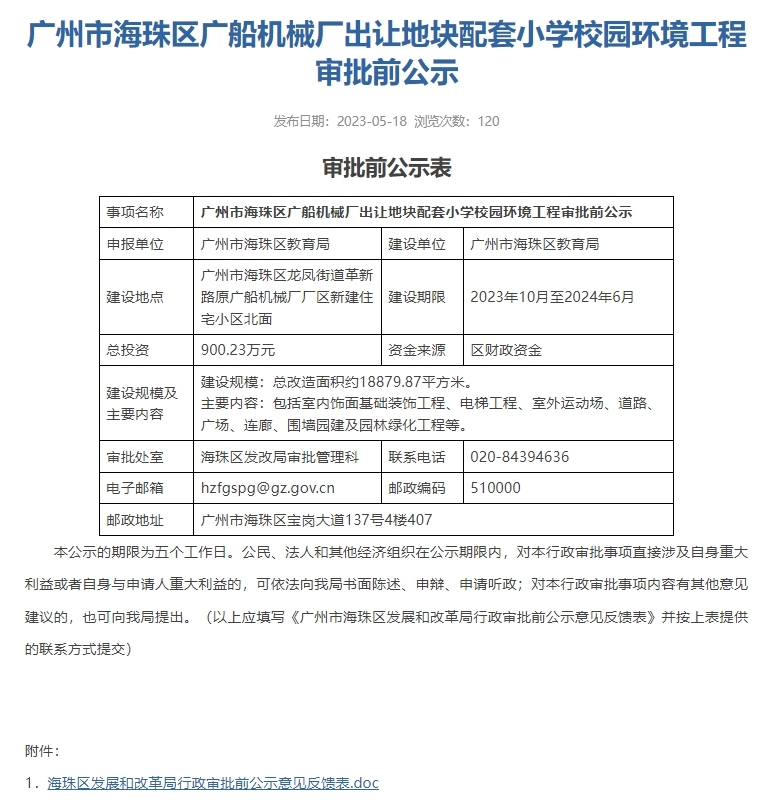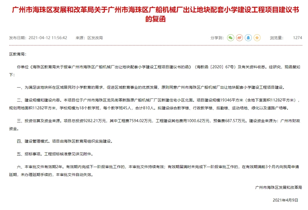 广州市海珠区发展和改革局2023年5月发布的海珠区广船机械厂出让地块配套小学校园环境工程审批前公示显示,工程总投资900.23万元,建设主要内容包括室内饰面基础装饰工程、电梯工程、室外运动场、道路、广场、连廊、围墙园建及园林绿化工程等。