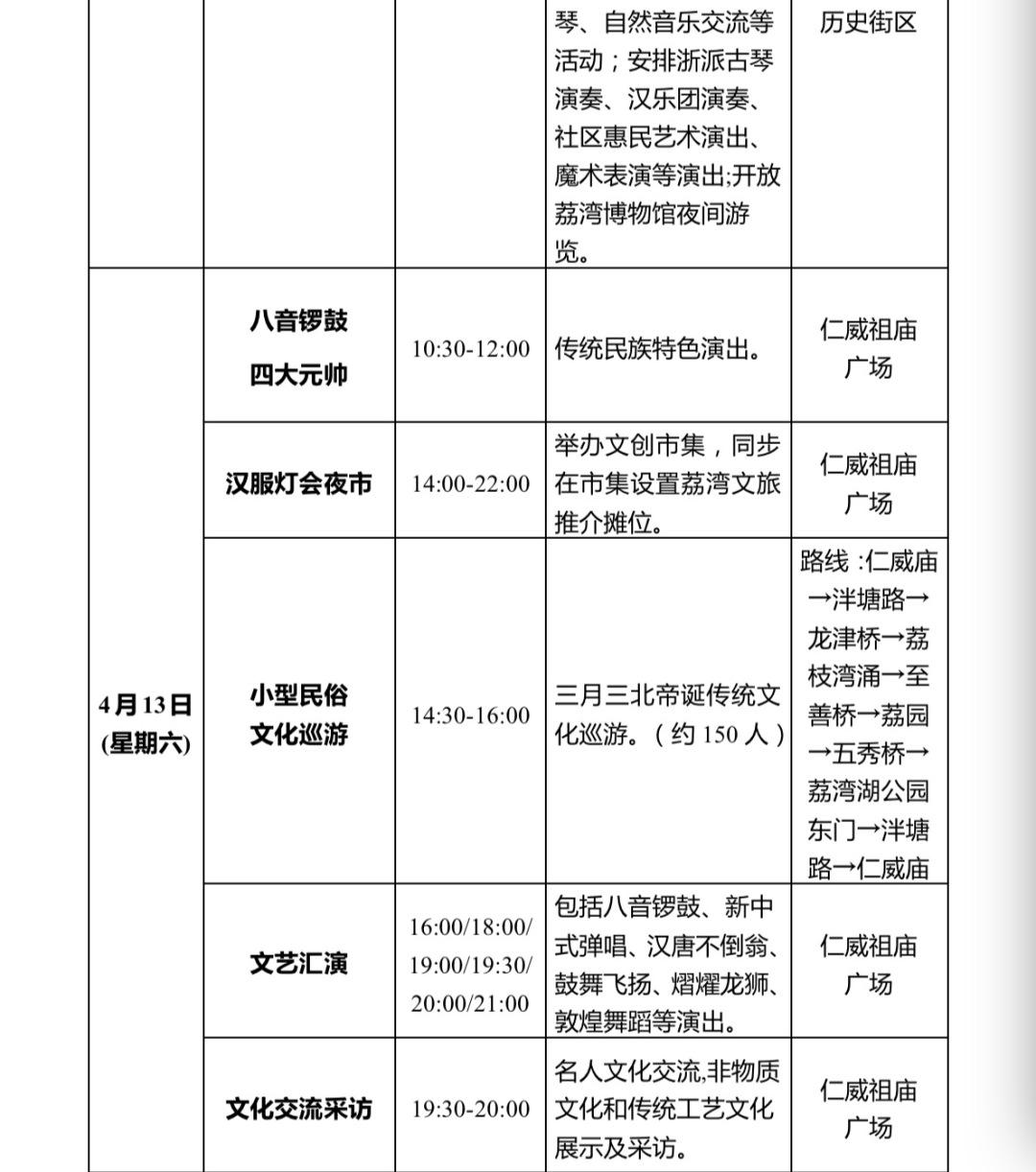 4月11日-13日,由广东省文化和旅游厅指导,广州市文化广电旅游局、佛山市文化广电旅游局支持,广州市荔湾区人民政府、佛山市南海区人民政府、佛山市禅城区人民政府主办的第十四届“荔枝湾·新西关”民俗文化活动之“三月三·荔枝湾” ——上巳春归、北帝诞、长桌宴活动即将开锣。