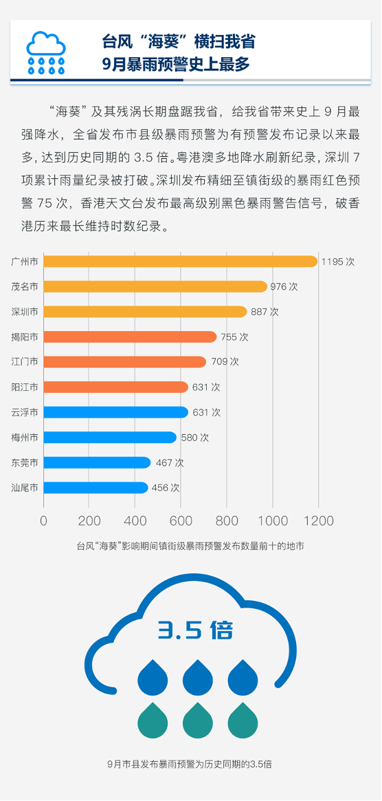 “海葵”及其残涡长期盘踞我省,给我省带来史上9月最强降水,全省发布市县级暴雨预警为有预警发布记录以来最多,达到历史同期的 3.5倍。粤港澳多地降水刷新纪录,深圳7项累计雨量纪录被打破。深圳发布精细至镇街级的暴雨红色预警75次,香港天文台发布最高级别黑色暴雨警告信号,破香港历来最长维持时数纪录。