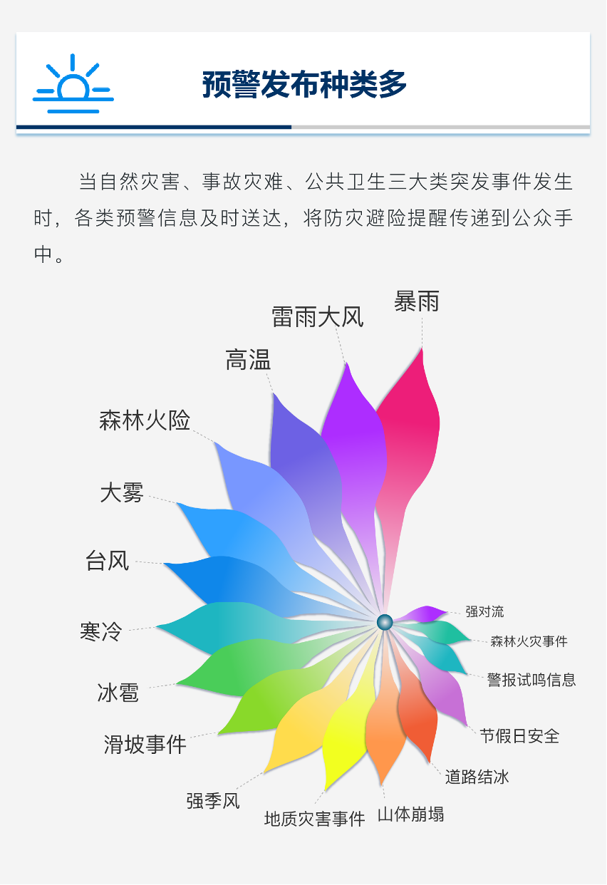 当自然灾害、事故灾难、公共卫生三大类突发事件发生时,各类预警信息及时送达,将防灾避险提醒传递到公众手中。