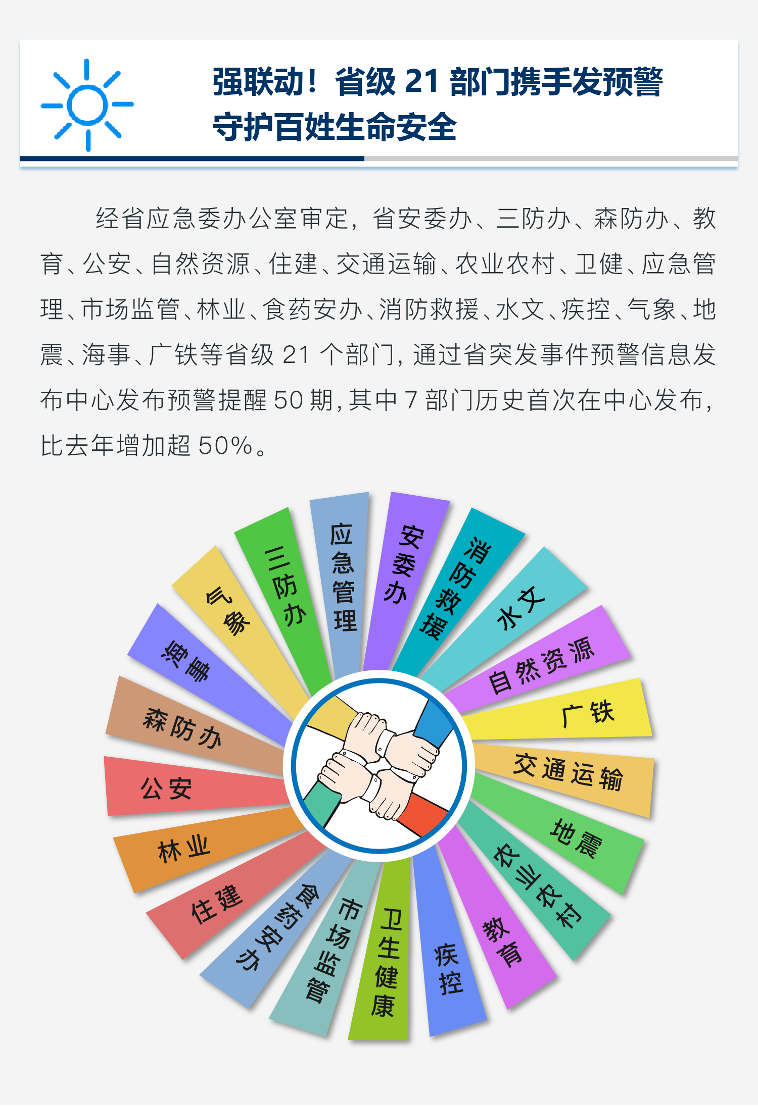 经省应急委办公室审定,省安委办、三防办、森防办、教育、公安、自然资源、住建、交通运输、农业农村、卫健、应急管理、市场监管、林业、食药安办、消防救援、水文、疾控、气象、地震、海事、广铁等省级21个部门,通过省突发事件预警信息发布中心发布预警提醒50期,其中7部门历史首次在中心发布,比去年增加超50%。
