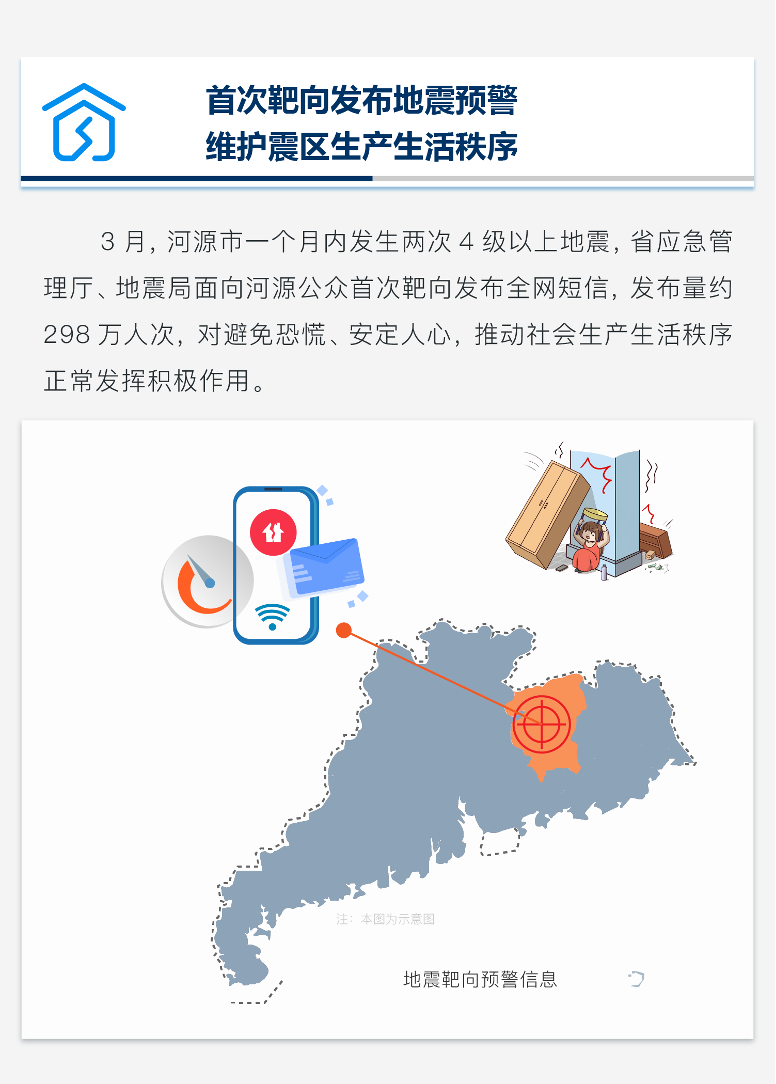 3月,河源市一个月内发生两次4级以上地震,省应急管理厅、地震局面向河源公众首次靶向发布全网短信,发布量约298万人次,对避免恐慌、安定人心,推动社会生产生活秩序正常发挥积极作用。