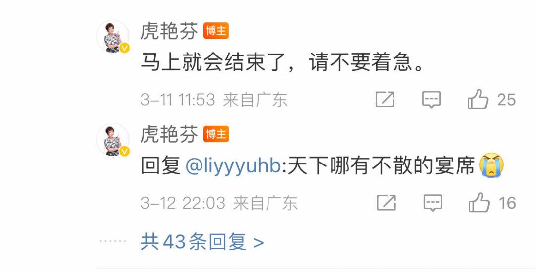《外来媳妇本地郎》播出集数缩减的消息引发网友关注,有网友表示不够看,对此,今年3月,该剧主演虎艳芬在微博回复网友留言时表示:“感谢广大观众这二十多年来的支持。”“马上就会结束了,请不要着急。”“天下哪有不散的宴席……”