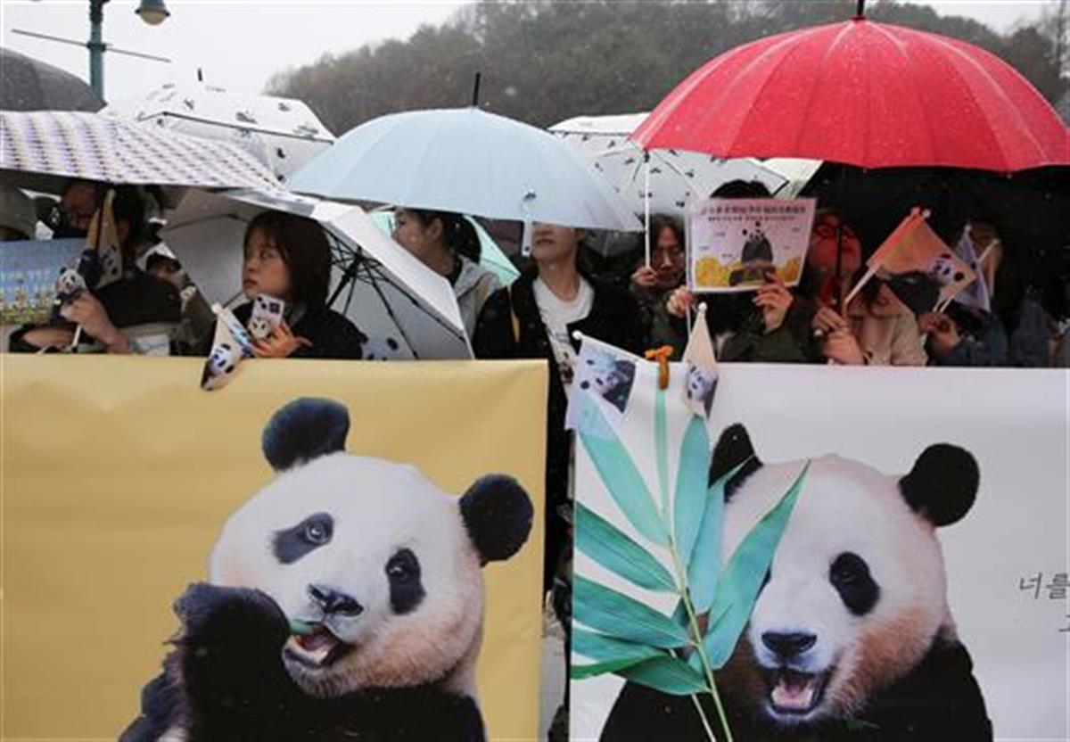 4月3日,韩国民众雨中送别“福宝”(图源:新华社)
