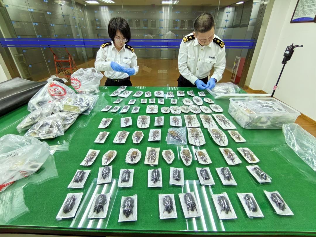 据了解,该批昆虫标本包括橘背叉角锹甲、南美黑艳锹甲、达尔曼尼鬼艳锹甲、褐斑背角花金龟等。其中,褐斑背角花金龟被列入《有重要生态、科学和社会价值的陆生野生动物保护目录》。