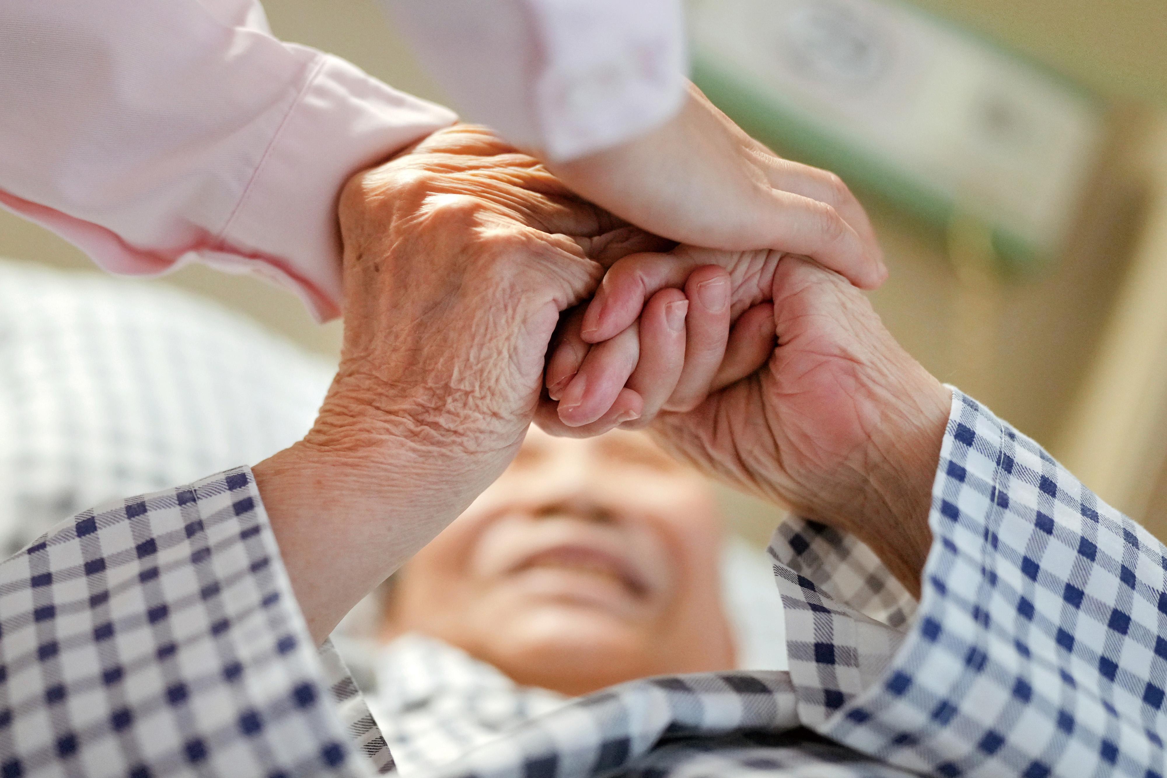 2023年4月25日,广州市桥医院康宁科,一位接受临终关怀服务的长者紧紧抓住护士的手,久久不愿松开。图/广州日报新花城记者:莫伟浓