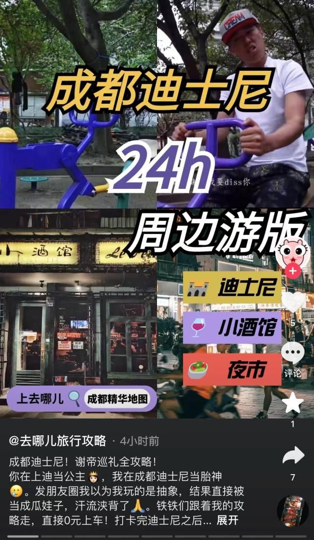 这里已经成为了当下可圈可点的旅游打卡地,“去哪儿旅游攻略”还在短视频平台上发布了成都“迪士尼”的24小时周边游攻略,还有自媒体博主推荐了周边的小吃,让这个小区附近的商业有了宣传的渠道。