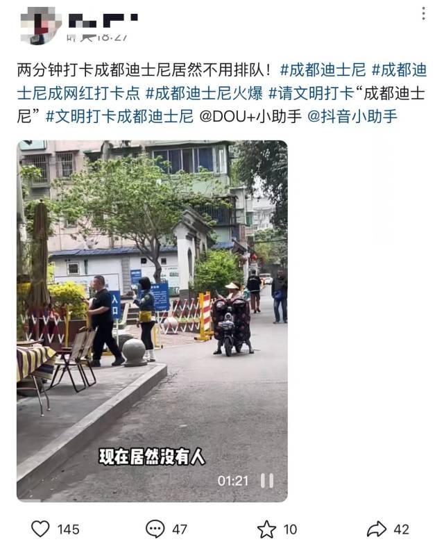 仍不断有网友在社交平台上分享自己的打卡经验,甚至有人惊讶表示,打卡成都“迪士尼”不用排队,只要2分钟。