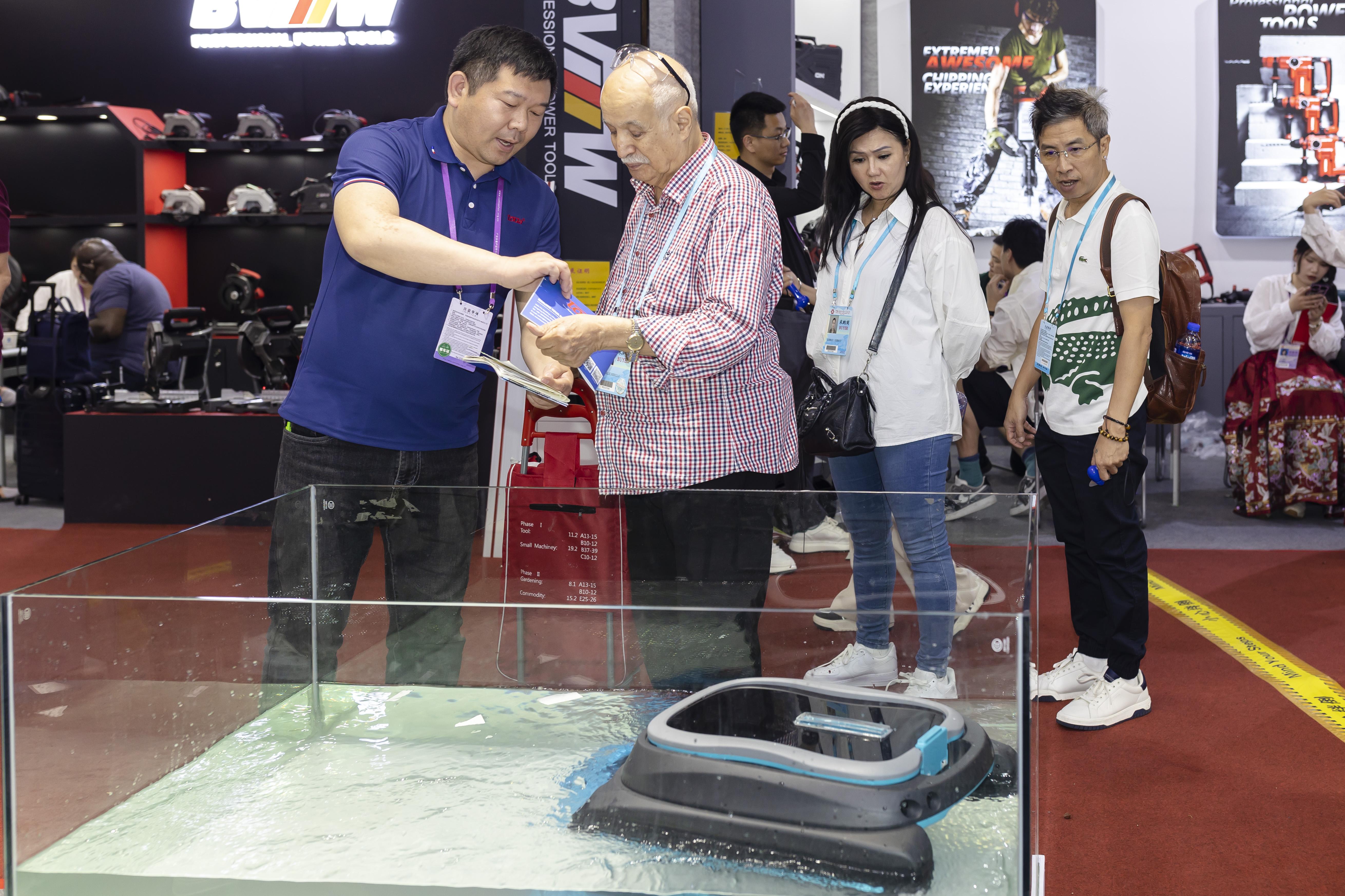 自带滚轮刷的清洁机器人缓缓潜入水中,爬上爬下地对现场一个微型泳池进行仔细清洁,不一会儿的功夫,泳池的内壁就变得干净透明。本届广交会上,新宝股份展位前的一款智能清洁机器人颇为吸睛。