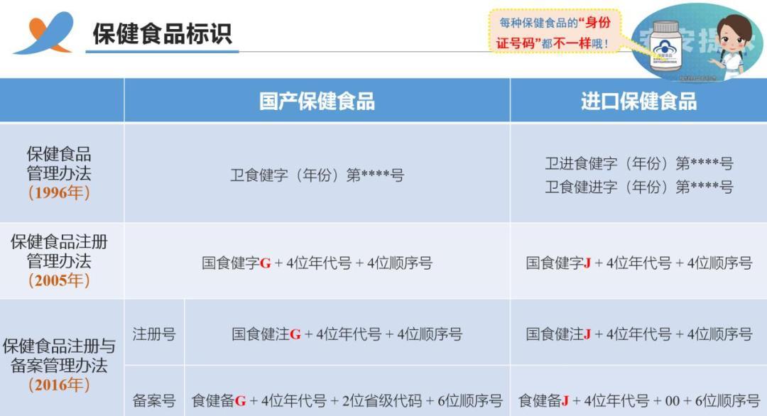 “小蓝帽”下方有“批准文号”,如“国食健字GXXXXXXXX”,而这就相当于保健食品的“身份证号码”。表示该产品是经过国家行政许可部门批准注册或者备案的保健食品。