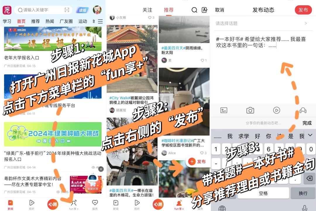 4月23日至5月22日,在广州日报新花城客户端的“fun享+”板块发布内容,标题带#一本好书#话题词,在正文写上推荐理由或文中最喜欢的一句话,并上传图书封面、最喜欢的一段(句)话内页图等,即可参与活动。