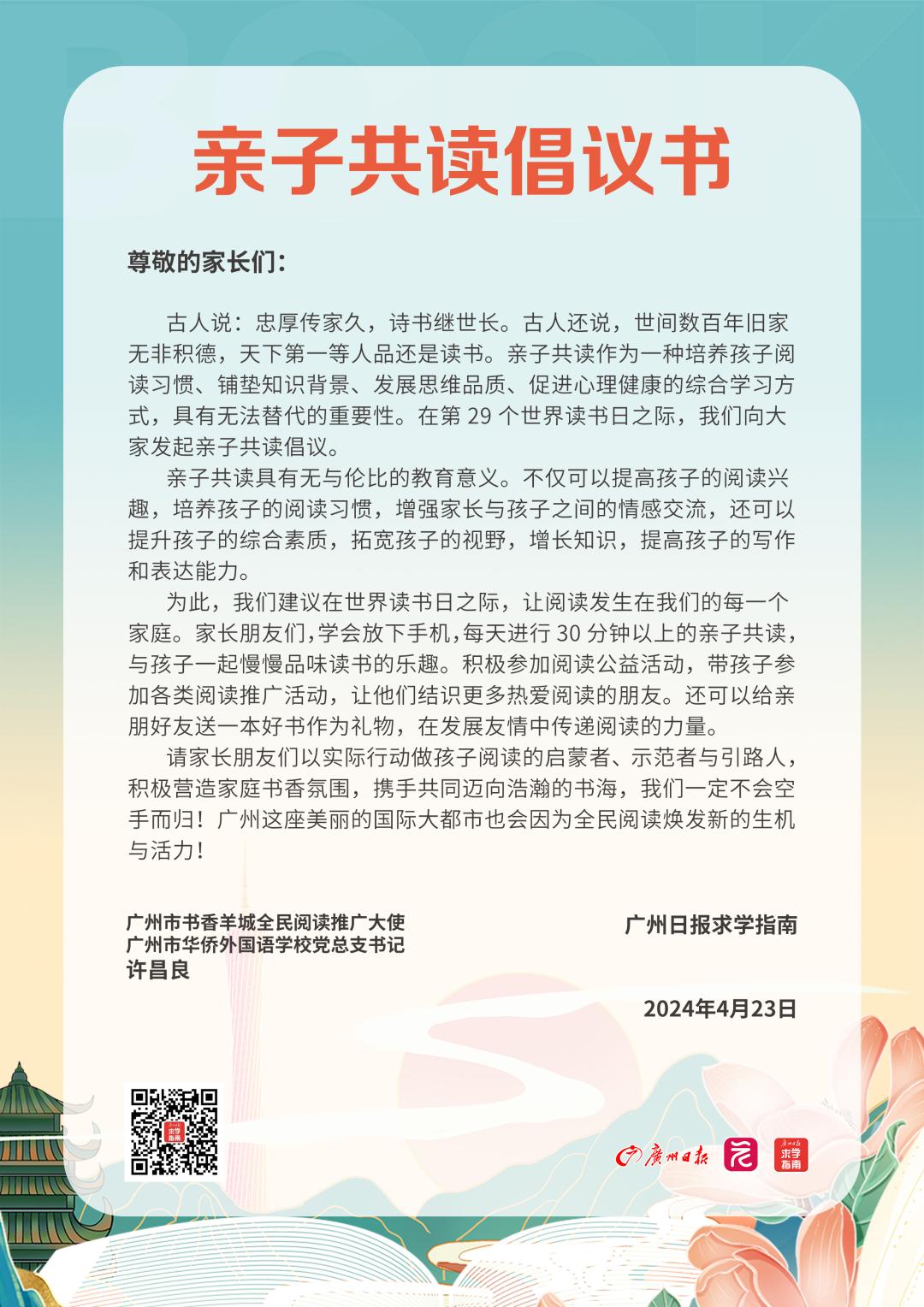 活动启动之际,广报求学与广州市华侨外国语学校党总支书记许昌良联合发布亲子共读倡议,呼吁全市家庭每天进行30分钟以上的亲子共读,与书为友,营造家庭书香氛围。