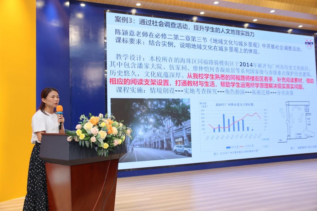 该校地理科老师谢敏辉介绍了南武中学地理科组推进的课堂项目式教学、野外研学、社会调查、校本课程、学科竞赛等多方面的教学案例,分享了深度教学背景下该校教师对落实地理学科核心素养的探索。谢敏辉表示,应以深度教学理念为指导,创新地理学习方式和教学模式,培养学生发展思维、地理区域认知思维、人地协调观等方面的核心素养。