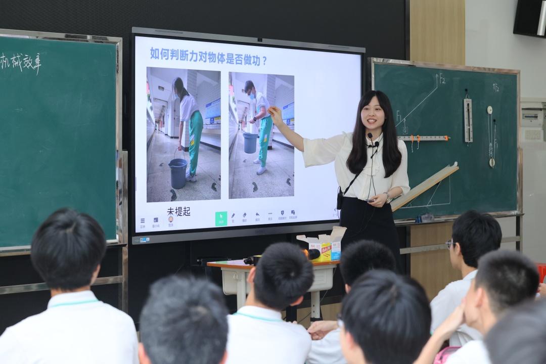 在由初三物理老师石蕴瑶执教的《功、功率和效率》课例中,老师以南武学子“提拉水桶”的图片创设情境,以环环相扣的任务驱动并引导学生理解和掌握如何比较机械的性能。同时,老师在教学中联系现实,让学生体会知识与技术创新、社会发展之间的关系,培养学生的社会责任感。