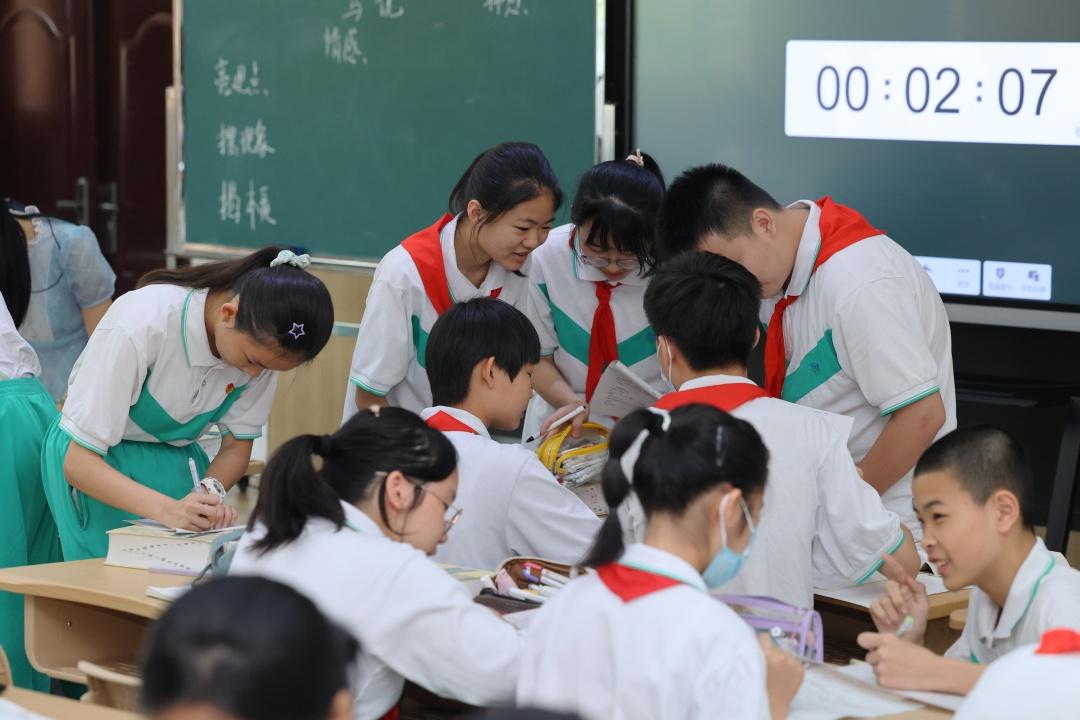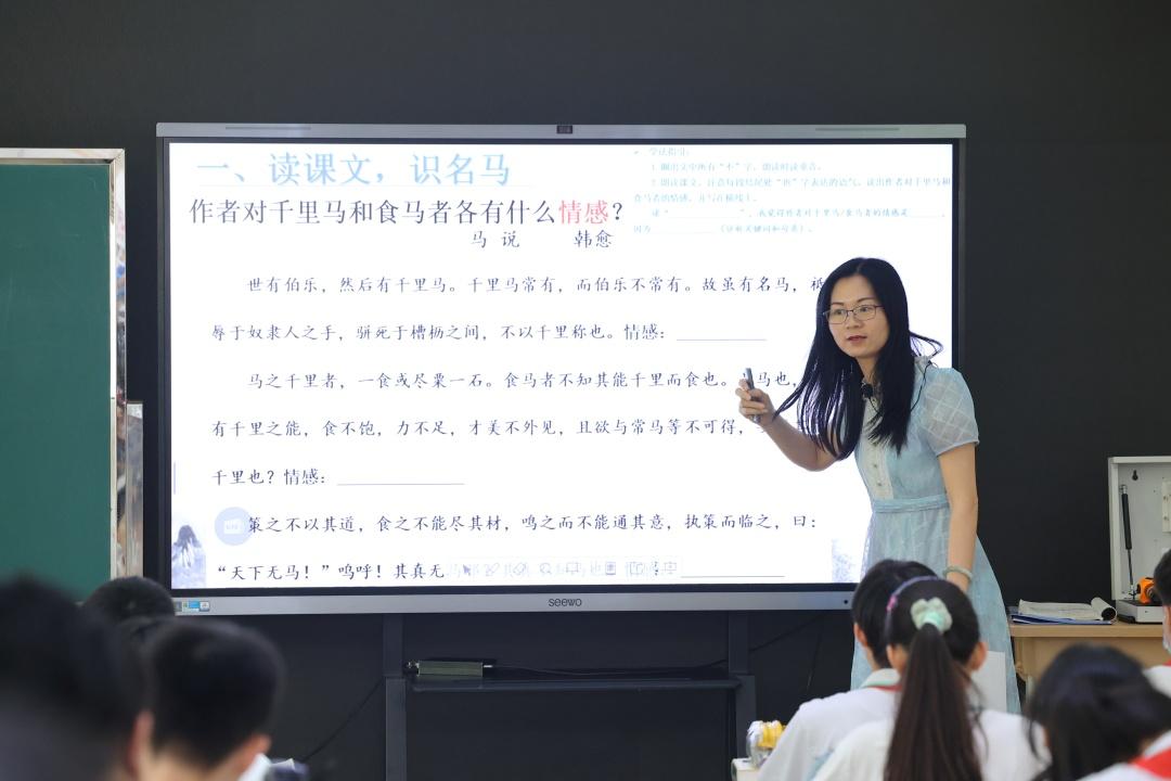 在南武中学语文老师潘彩幸展示的《马说》课例中,老师以新课标和深度教学的理念为指导,引导学生进行互动式学习、探究式学习,在小组合作过程中理解韩愈怀才不遇的愤慨,让学生在朗读中沉浸式体验韩愈情感的递进。