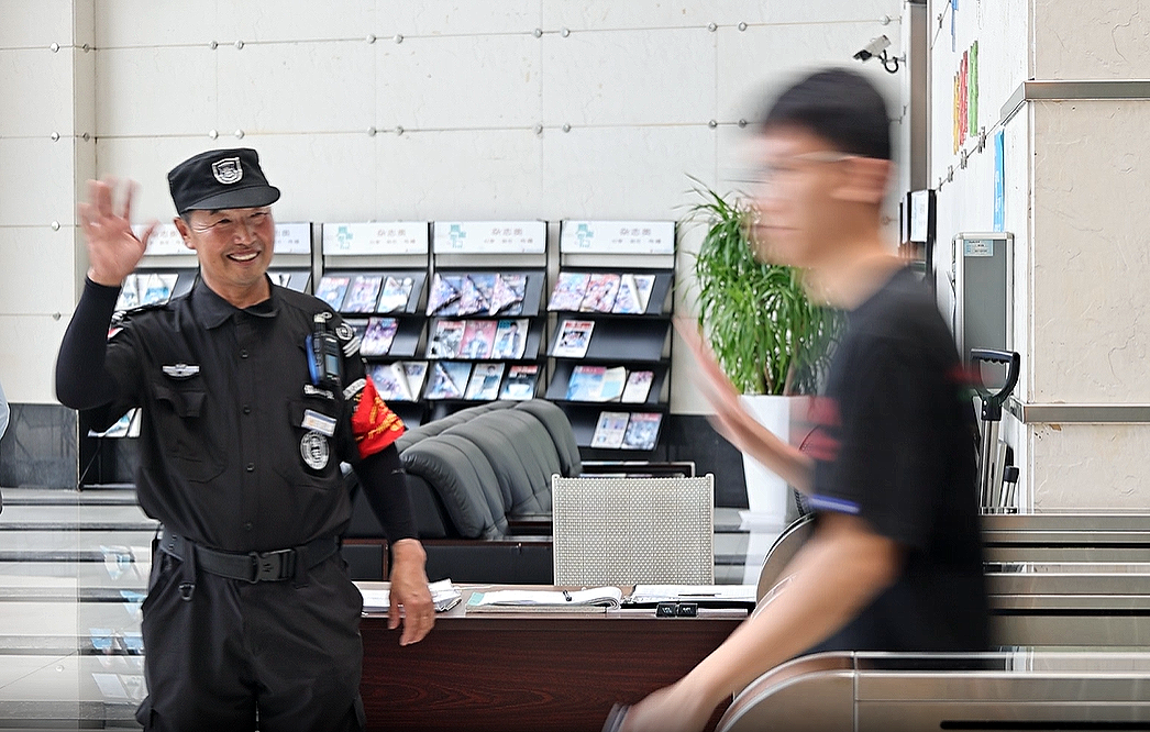 微笑、点头、挥手,再致以问候——在接受采访时,当看到有人进出图书馆,刘国连也依然会重复这些动作,这大概已经成为他的习惯。虽然在网络爆红,但刘国连的工作的生活依然在按部就班。这段时间,刘国连上的是白班,从早上7时到晚上7时,他都会在图书馆门口迎来送往。下个月,他还要上夜班。“在图书馆,我看到同学们安安静静地认真学习,我也看到3楼的一位老师,有时候工作到半夜2点才下班,这些都真的令我非常感动。他们都是国家的栋梁。”