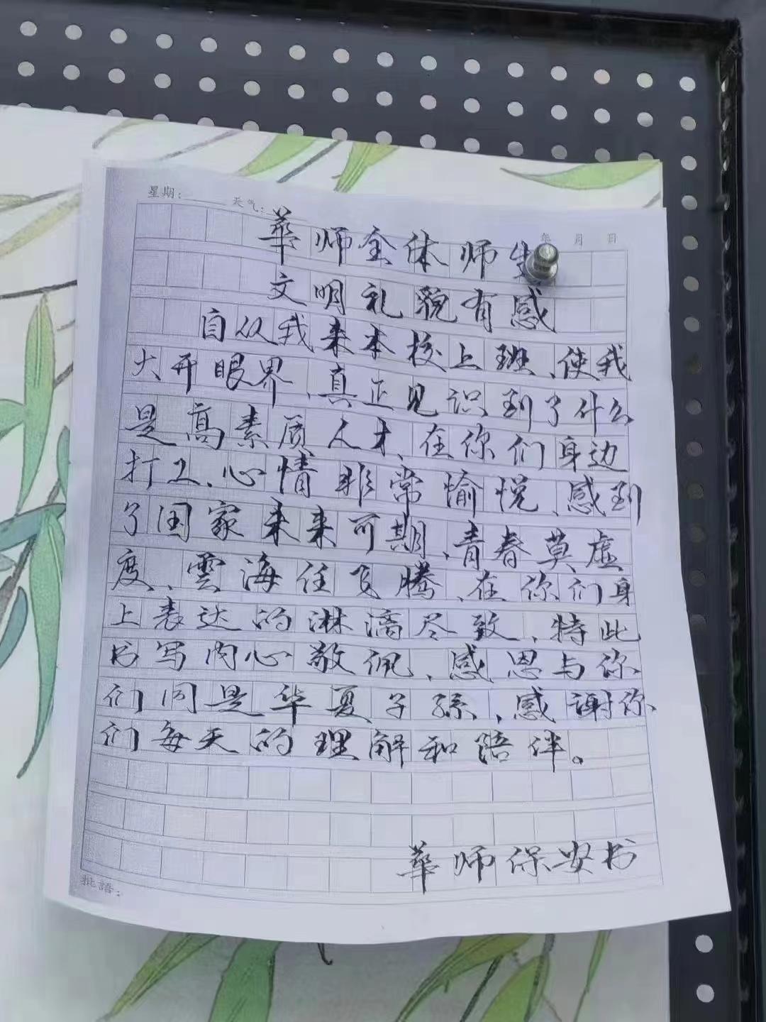 “自从我来本校上班,使我大开眼界,真正见识到了什么是高素质人才。在你们身边打工,心情非常愉悦,感到了国家未来可期。青春莫虚度,云海任飞腾,在你们身上表达得淋漓尽致,特此书写内心敬佩,感恩与你们同是华夏子孙,感谢你们每天的理解和陪伴。”