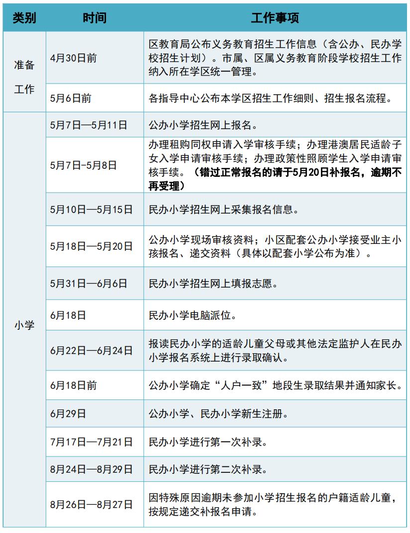 (二)5月7日-5月8日,租购同权学生、广州市政策性照顾借读生及港澳居民适龄子女向居住地教育指导中心申请入读小学一年级(错过正常报名的请于5月20日补报名,逾期不再受理)。