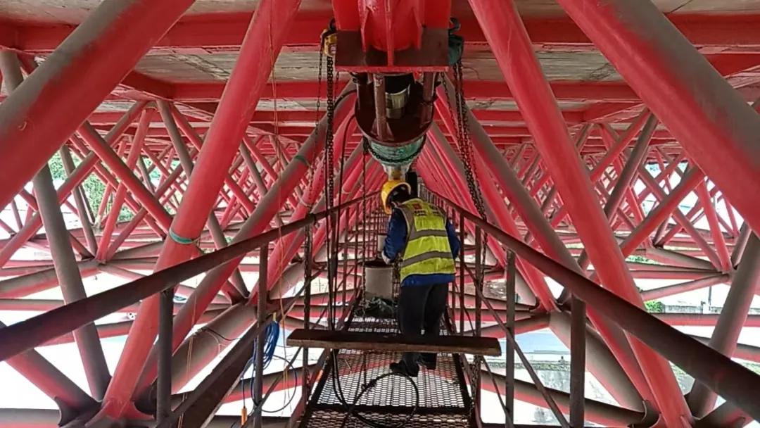 二是施工工艺难度大。在更换钢索时,旧索导管套筒内径过小,需扩大导管内径,确保新索顺利安装。桥面端的套筒扩孔难度可控,但高塔端的套筒扩孔必须进行高空作业。这个问题在同类桥梁中未曾出现,没有先例和经验可循。