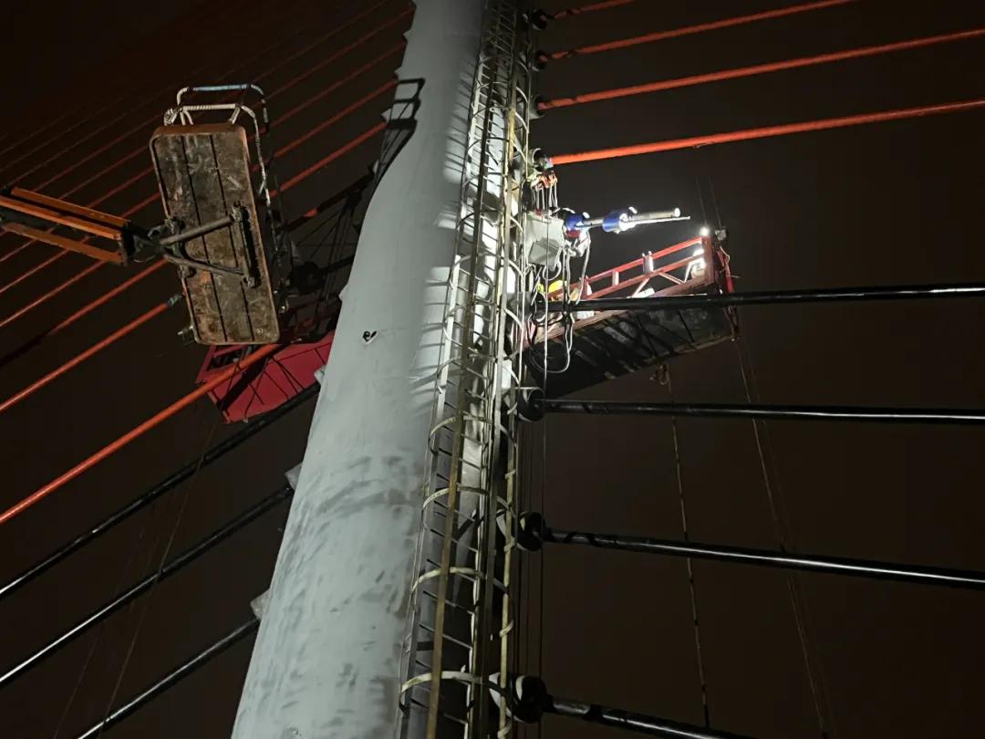 紫洞大桥维修加固工程主要包含桥面铺装维修,更换破损的桥梁支座,更换全桥旧的斜拉索。目前桥面铺装维修和桥梁支座更换已全部完成,76根斜拉索完成更换30根,项目总体工程已完成46%。由于天气、场地和工序限制,为了加快施工进度,现场已安排最充足的施工力量,在天气条件允许的情况下,24小时三班倒不间断施工。