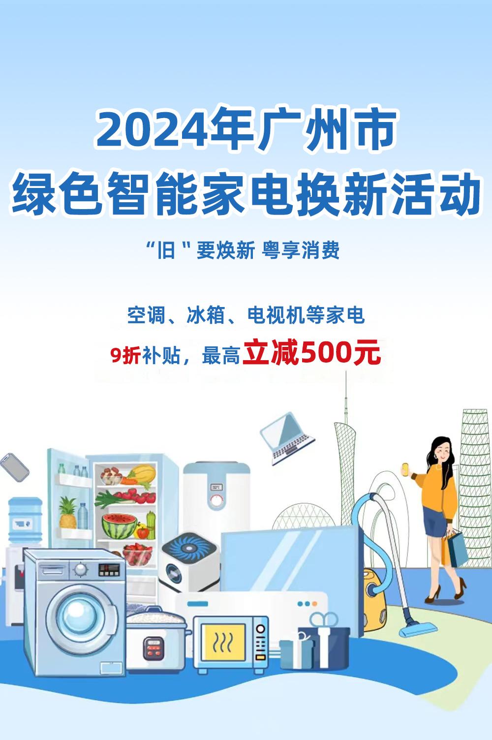 为贯彻落实《国务院关于印发<推动大规模设备更新和消费品以旧换新行动方案>的通知》(国发〔2024〕7号)、《广东省人民政府办公厅关于印发广东省推动消费品以旧换新行动方案的通知》(粤办函〔2024〕48号)要求,进一步释放绿色智能家电消费潜力,促进家电以旧换新和节能减排,广州市商务局现正式开展2024年广州市绿色智能家电换新(即家电“以旧换新”)活动。
